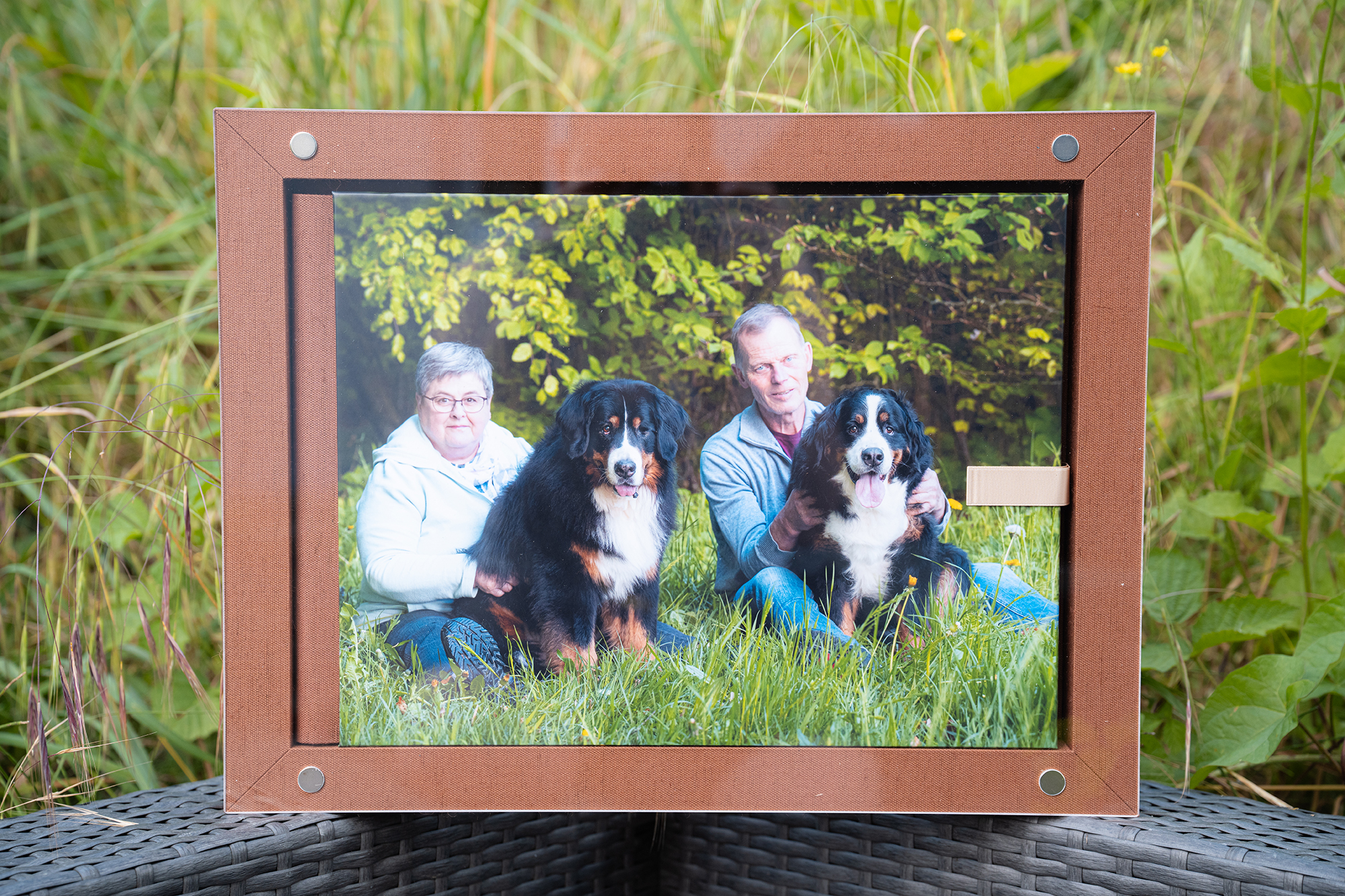Nach der Session durfte ich für Eva und Martin eine einzigartige Holzcollage gestalten – mit Bildern von Naduah und Lotti. Dazu kam ein liebevoll gestaltetes Fotoalbum, das die Geschichte dieses Frühlingsabends erzählt. Als weiteres Fotoprodukt entstand ein Bild aus Holz, das an die erwachsenen Kinder von Eva und Martin verschenkt wurde – eine ganz besondere Art, Freude weiterzugeben.